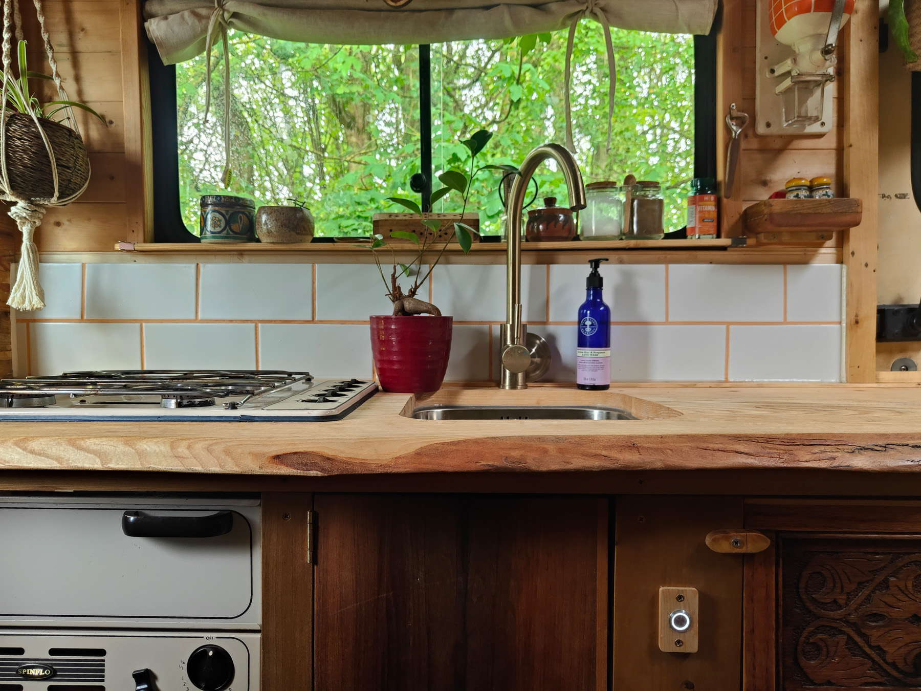 Everything you see in the photos is fitted by us. Bluebell is brimming with reclaimed materials and reconditioned kit. The majority of the woodwork in the van is reclaimed from various pieces of unique furniture. We strive to build our vans with distinctive design flairs and flourishes, whilst keeping the space useful and practical.